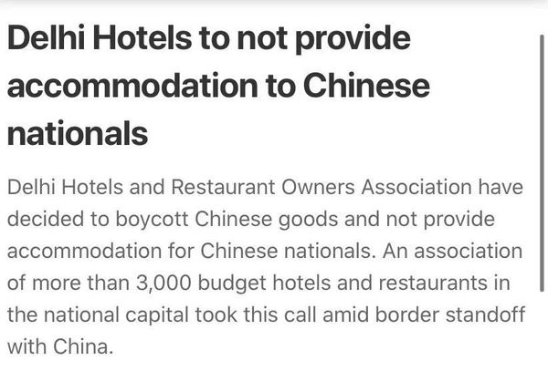 在印度,甩锅中国已经升级为了“抵制中国”。印度首都德里地区的3000家酒店将不再向中国公民提供服务,这一倡议来自德里酒店与餐馆业主协会(The Delhi Hotel and Restaurants Owners Association)。不过这则新闻背后的背景是,这3000家基本上都属于叫不上名的廉价宾馆,并且目前几乎全部的酒店与餐饮行业都处于关门状态。