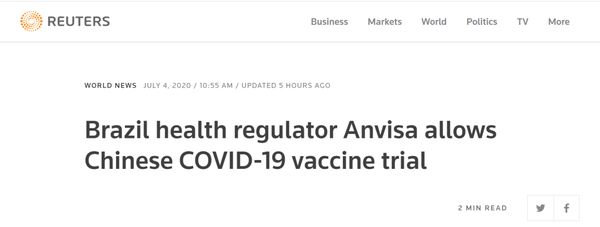 路透社消息称,巴西国家卫生监督局(ANVISA)当地时间7月3日批准中企研发的新冠肺炎疫苗在巴进行临床试验。
