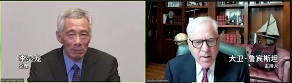 28日晚,李显龙(左)昨晚参加美国智库大西洋理事会的线上视频座谈会,右为大卫·鲁宾斯坦。(视频截图)