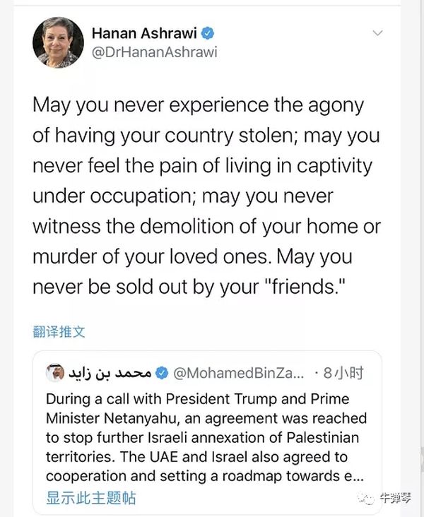 我看到,阿联酋阿布扎比王储穆罕默德,刚发推宣布和以色列关系正常化,巴解组织执委会成员,老资格的阿什拉维女士,立刻悲愤地转发写道: