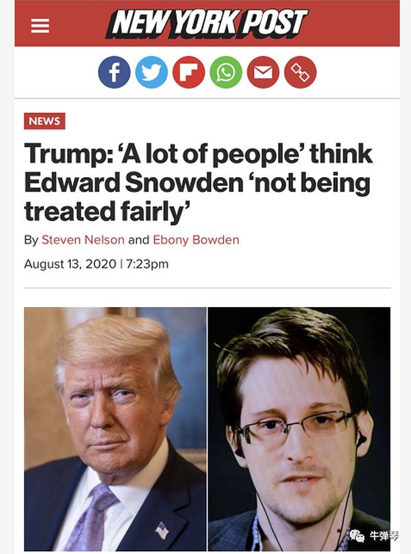 《纽约邮报》特别点出,这是特朗普当上总统后,第一次公开评论斯诺登。在谈到斯诺登之前,他重复了以前的指控,奥巴马和拜登对特朗普阵营进行监听,blablablabla。