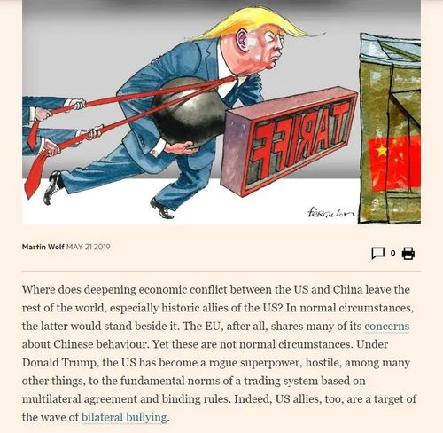 后来到5月的时候,《金融时报》专栏作家马丁·沃尔夫也公开撰文,说美国变成了一个“流氓超级大国”,与我们的判断也高度吻合。他具体是这么写的:中美贸易战中,欧洲作为盟友,本来应该支持美国,但现在美国变成了不守规矩的流氓超级大国,我们不能支持它……更糟糕的是,很多美国人对中国的敌意,不是因为中国采取了什么具体的行动,而仅仅是因为它崛起了的这么一个事实。