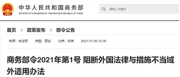 1月9日,经国务院批准,中国商务部正式对外公布2021年1号文件——《阻断外国法律与措施不当域外适用办法》,并自即日起开始实施。