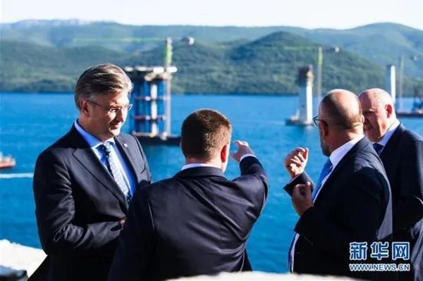 2020年5月25日,克罗地亚总理普连科维奇(左一)视察中企承建的佩列沙茨跨海大桥(统一大桥)项目图丨新华社