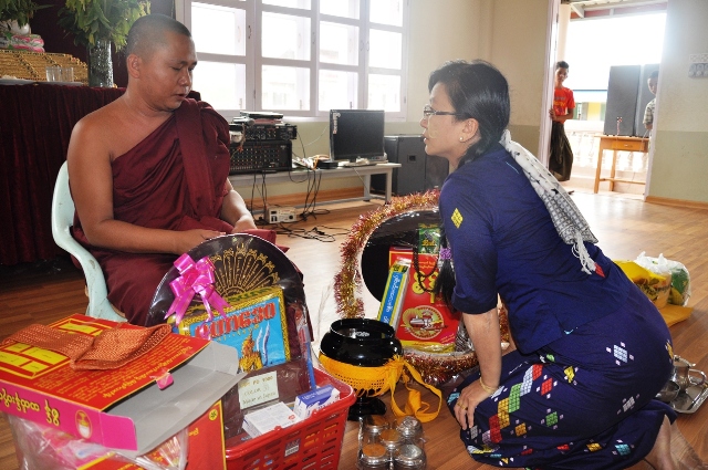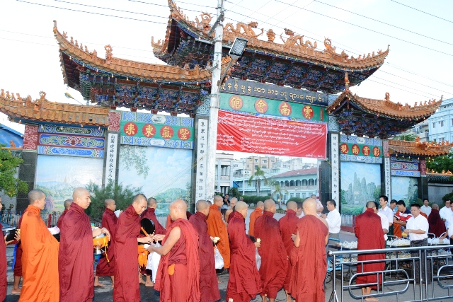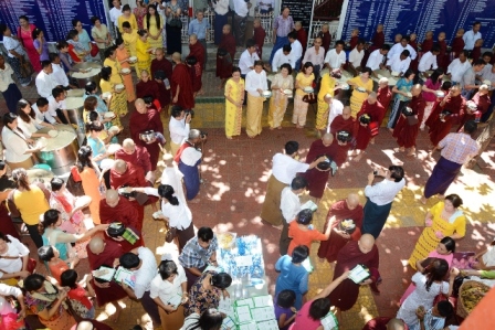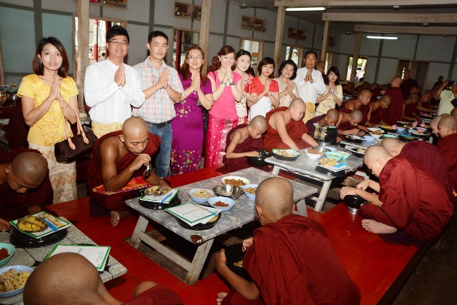 2014年7月11日,即缅甸瓦梭月盈节戒斋日,早上6时,曼德勒云南同乡会监事长、副理事长、全体理监事成员,向曼德勒市内27家寺庙的256名僧侣布施早膳及功德金。