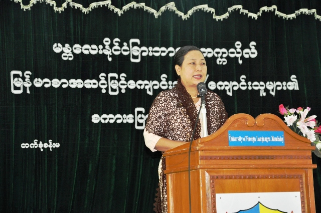 赛前首先由曼德勒外国语大学校长吴佐林教授讲话。他说掌握一门外言,不但能解决就业问题,而且能得到高薪职业。校长说曼外大自2003-2014已培养265位学缅语的中国留学生。他们都已分布在各个工作岗位,为中缅友好做出贡献;接下来副校长杜丁丁讲话,她说,语言是文化的基础,也是人与人沟通交流的工具,缅中自古以来是友好邻邦,懂得彼此国家的语言是很重要的,可以增加沟通与了解;副校长吴昂奈寿说,得知从曼外大学业完成后,在各行各业已被聘请任职的中国学子分布各地,感到很欣慰,也为此感到自豪;随后缅文系主任多索莫莫解释了此次活动的目的,以及打分内容。据悉,打分内容分为五个部分:咬字、音调、台风、表情、内容是否合题等。