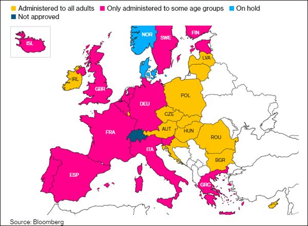 尽管世卫组织屡次重申,继续使用阿斯利康新冠疫苗,利大于弊。但根据彭博社统计,截至目前,仍有许多欧盟国家暂停或者限制接种阿斯利康疫苗。