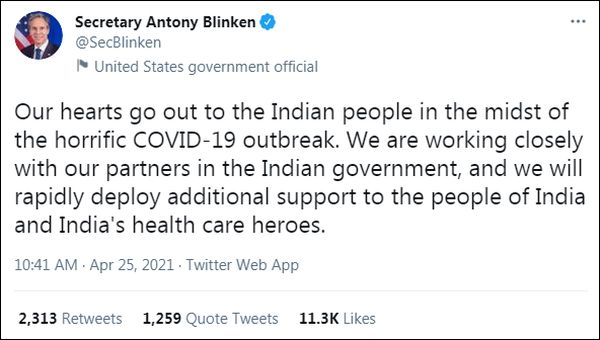 美国务卿布林肯同一天也发推称,对印度疫情深表同情,“美国将迅速为印度提供更多支援”。