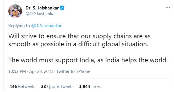4月23日,印度外交部长苏杰生发布了一条推文,称“在困难的全球形势下,我们将努力确保供应链尽可能顺畅。世界必须支持印度,就像印度帮助世界一样”。《印度报》报道指出,这一推文被认为是针对“美国优先”的回应,美国为了优先满足美国内需求,阻碍了疫情相关物资的出口。