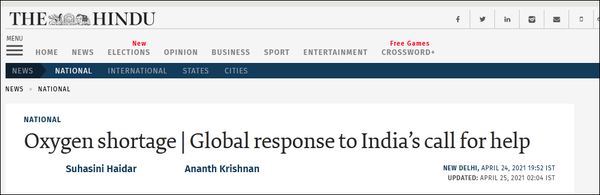 “氧气短缺:全球响应印度求助” 印媒报道截图