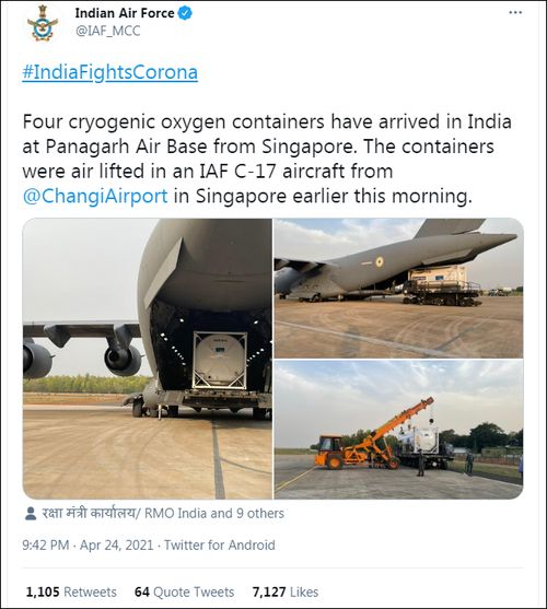 4月23日,印度空军发布推文称,他们已出动C-17和IL-76运输机,为全国各地空运氧气罐。到了4月24日,印度空军又发推称,印度空军出动C-17运输机,已将4个用于储存医用液氧的大容量氧气罐从新加坡樟宜机场空运回印度巴纳格尔(Panagarh)空军基地。