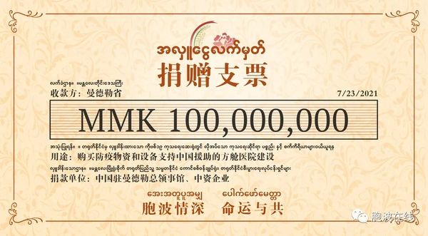 7月23日,驻曼德勒总领事馆和上海市政府外事办公室共同在线举办“上海—缅北疫情防控经验专题交流会”。中国驻曼德勒总领事陈辰、上海市外办负责人、曼德勒省管理委员会委员吴登泰出席并致辞。上海市疫情防控专家、复旦大学附属华山医院感染科主任张文宏在线专题授课并与缅北地区中资机构、华侨华人代表互动交流。交流会上,陈辰总领事宣布总领事馆会同缅北中资企业,向由中国云南省昆明市援助曼德勒市的方舱医院捐赠1亿缅币,用于购买所需医用耗材。