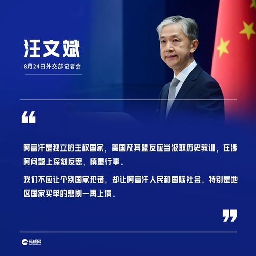 汪文斌说,中方认为,国际社会在推动阿局势平稳过渡和国家重建进程的同时,也有必要思考如何防止打着民主旗号对他国进行军事干涉的行径再次发生。我们不应让个别国家犯错,却让阿富汗人民和国际社会,特别是地区国家买单的悲剧一再上演。