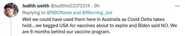“好吧我们可以在澳大利亚使用它们,因为新冠病毒德尔塔变异株影响很大......我们向美国乞求即将过期的疫苗,拜登拒绝了。我们(现在的接种情况)比疫苗计划落后了6个月。”