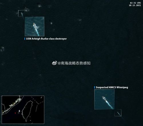 据卫星影像显示,10月15日上午10时许,台湾海峡南口发现美军一艘“阿利伯克”级驱逐舰和加海军一艘“哈利法克斯”级护卫舰正向北航行,推测正在联合进行穿越台湾海峡行动。