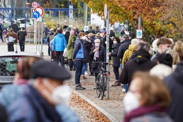 11月12日,人们在德国首都柏林一处新冠疫苗接种中心外排队等待。(新华社发,斯特凡·蔡茨摄)