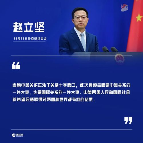 发言人赵立坚表示,当前中美关系正处于关键十字路口,此次视频会晤是中美关系的一件大事,也是国际关系的一件大事。中美两国人民和国际社会都希望会晤取得对两国和世界都有利的结果。根据双方商定,习近平主席将同拜登总统就事关中美关系未来的战略性问题,以及双方共同关心关切的重要问题,坦诚深入充分交换意见。希望美方同中方相向而行,加强对话合作,有效管控分歧,妥处敏感问题,探讨新时期中美作为世界大国相互尊重、和平共处的相处之道,推动中美关系重回健康稳定发展的正确轨道。