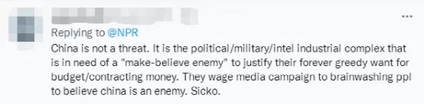 一名网友在NPR的这篇报道下留言,直接指出“中国不是威胁”,美国在制造一个“假想敌”,通过“发动媒体运动给人民‘洗脑’,让他们相信中国是敌人”。