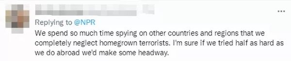 NPR将这篇报道发布在社交媒体推特上后,虽然有一些美国网友跟着起哄,在评论区一同叫嚷所谓“中国威胁”,但也有“头脑清醒的”网友点出,美方更应该把精力放在解决自身问题上,比如本土恐怖主义。