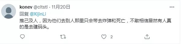 有网友说,果然是“贼看所有人都像贼!” 还有网友说,“推己及人,因为他们去别人那里只会带去炸弹和死亡,不敢相信居然有人真的是去建码头。”