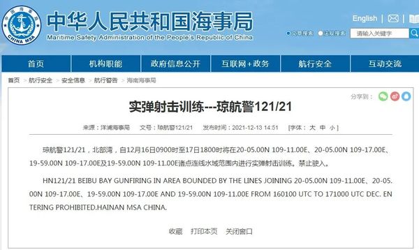 中国海事局网站13日发布了三条航行警告,都与解放军在相关海域进行实弹射击训练有关。一是清澜海事局发布航行警告:2021年12月15日,6时至19时,在南海海域A:19-57.25N/111-09.13E、B:19-57.25N/111-14.88E、C:19-51.80N/111-14.88E、D:19-51.80N/111-09.13E诸点连线范围内进行实弹射击训练,禁止驶入。