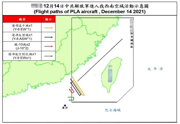 从台军方发布的航线图来看,解放军军机巡航的路线主要在台“防空识别区”的左下角一带,不过台军方并没有发布解放军军机巡航的具体时间,只是在空情动态通报中提到是14日日间。从目前的有限信息,还不能判断当天解放军军机与美军侦察机之间是否有一定的时空重叠。