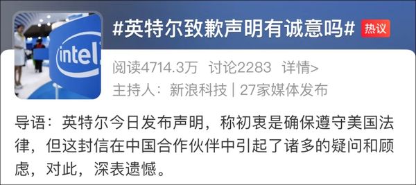 对于英特尔这份中文声明,中国网友众说纷纭。截至发稿,“英特尔致歉声明有诚意吗”的微博话题阅读量,已超4700万。