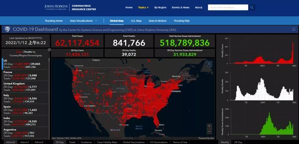 根据美国约翰斯·霍普金斯大学统计数据,截至北京时间2022年1月13日10时15分,美国新冠肺炎累计确诊病例达到62727044例,累计死亡病例达到843624例。