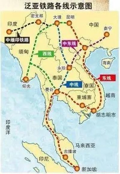 未来的泛亚铁路图,中国从缅甸出海距离印度洋、非洲、欧洲最近。