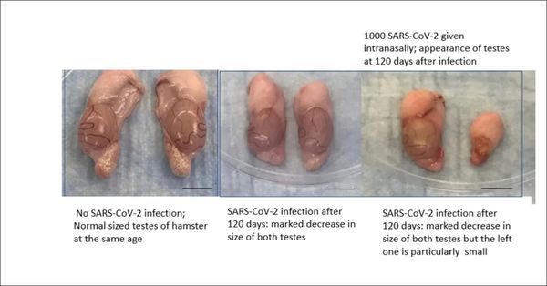 香港大学(港大)微生物学系团队的研究发现,仓鼠即使被中量的新冠病毒 (SARS-CoV-2)感染,也会出现急性睪丸损伤,慢性睪丸萎缩和血清内的睪丸酮下降。此前,据研究记载,部分新冠肺炎患者有睪丸疼痛的情况,一项针对新冠肺炎男性死者的尸检也显示出现了睪丸炎的症状。