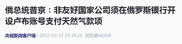 当地时间3月31日,俄罗斯总统普京宣布,4月1日起非友好国家公司应当先在俄罗斯银行开设卢布账号,再经由此账号支付所购买的俄罗斯天然气。
