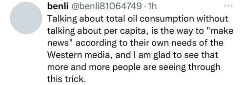 “谈石油消费量却不谈人均,这就是西方媒体根据自身需求‘造新闻’的手段吧,很高兴看到越来越多的人识破了这一伎俩。”