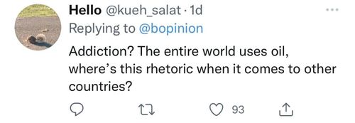 “上瘾?全世界都用石油,讨论其他国家的时候怎么不见这种修辞手法?”
