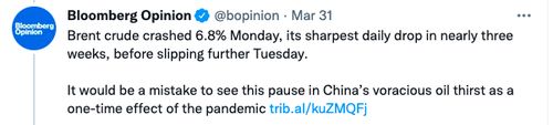 北京时间3月30日,一向爱对中国发展指指点点的彭博社社评版块“Bloomberg Opinion”发布了一篇题为《没有中国的需求,石油市场将如何应对?》的文章,炒作“中国巨大的原油需求威胁世界”论,宣称中国对储备石油“上瘾”,需求“贪婪”,这会对地球“构成威胁”,给环境带来负担。
