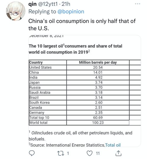 这番说辞,在外网“喜获”大量嘲讽。有网民甩出中美石油消费量对比,讽刺彭博社的“双标”,还有人质问:“你们是在指责一个人口占全球18%的国家,石油消费量只占全球的15%?”