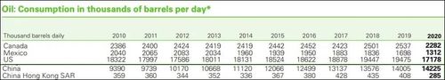 其实根据BP公布的2020年石油消耗数据,别说中国人均石油消费量远低于美国,就是日均消费总量也比美国少得多(下图单位为千桶)。