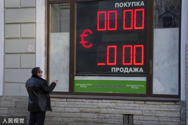 当地时间2022年3月7日,俄罗斯莫斯科,当地银行外显示着实时卢布汇率,商场里生意寂寥。西方国家加剧对俄罗斯的经济制裁,卢布持续下跌,越来越多西方大型公司退出俄罗斯市场。