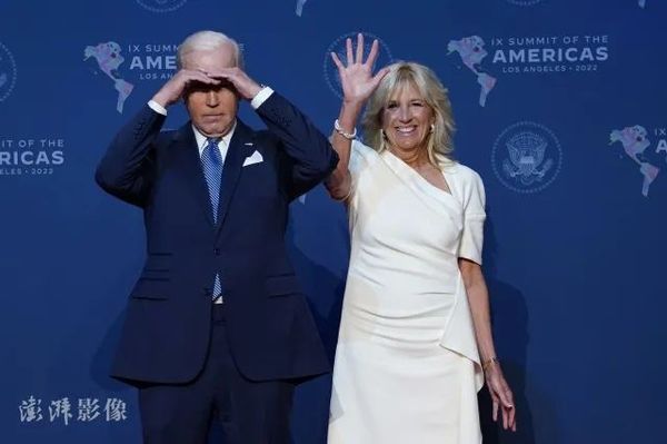 当地时间6月8日,美国总统拜登和妻子吉尔出席美洲峰会,迎接各国领导人。图自澎湃影像