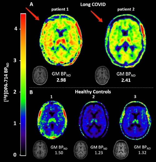 研究发现,长新冠患者1在所有脑区的[18F]DPA-714结合严重升高。其2T4k_VB模型获得的全脑灰质定量BPND(=k3/k4)相对于健康对照受试者平均增加了121%。长新冠患者2的[18F]DPA-714结合也升高了,从2T4k_VB模型获得的全脑灰质BPND(=k3/k4)相对于健康对照受试者平均增加79%。