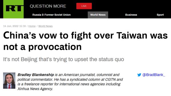 “今日俄罗斯”(RT)网站:“中国要为台湾(地区)而战的誓言不是挑衅”