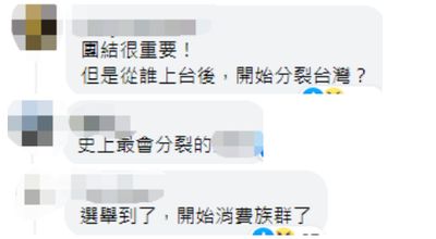 还有人说,“团结很重要!但是从谁上台后,开始分裂台湾?”“史上最会分裂的‘总统’,装模作样。”“选举到了,开始消费族群了。”↓