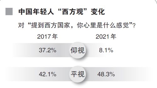 2021年环球舆情中心一份覆盖中国100多个城市的民调显示,中国年轻人在过去5年“平视”西方国家的比例上升6个百分点,“仰视”西方的比例下降大约29个百分点。