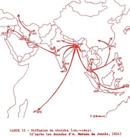 1830年霍乱首次登陆欧洲,1832年首次到达美洲,1852年以后首次在印度之外的亚洲大面积暴发,每一次大流行都有数十万至百万人死亡。