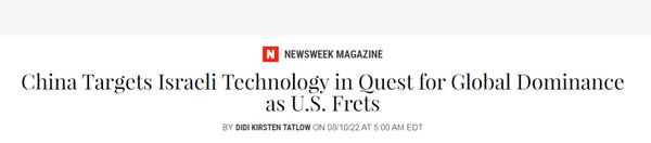 美国《新闻周刊》8月10日文章,原题:美国忧心中国瞄准以色列技术谋求全球主导地位 华盛顿正密切关注其在中东的重要盟友。