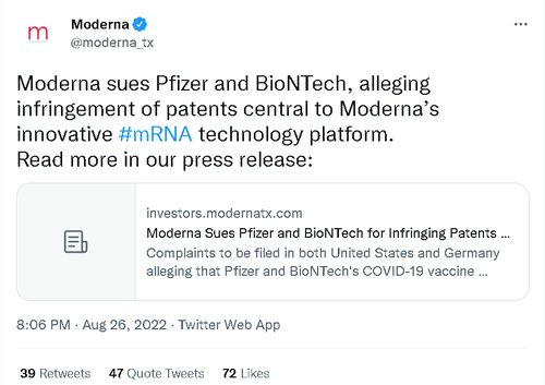 在北京时间8月26日晚8时06分,美国知名药企莫德纳在其社交账号上发帖,宣布该公司将就侵犯专利权一事起诉美国另一家大型药企辉瑞以及与辉瑞合作研发新冠疫苗的德国BioNTech公司。莫德纳称,这两家公司推出的新冠疫苗,侵犯了莫德纳的mRNA技术专利。