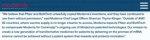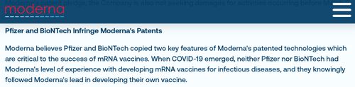 在一份发布在莫德纳官网的声明中,莫德纳表示该公司在2010年到2016年间注册了多项创新型的mRNA技术专利,并使用这些突破性的技术研发出了莫德纳自家的新冠疫苗产品“Spikevax”。而辉瑞和BioNTech的新冠疫苗“Comirnaty”,根据莫德纳的指控,是在未经莫德纳许可的情况下“复制”莫德纳的技术研发出来的。