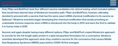 综上所述,莫德纳表示,该公司决定起诉辉瑞和BioNTech,以保护这些莫德纳投入了数十亿美元创造出的、并在10多年前就已经申请专利的、领先的创新型mRNA技术。