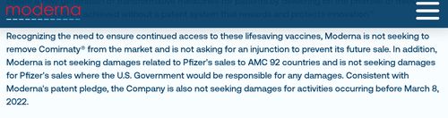 莫德纳还表示不会就辉瑞和BioNTech在2022年3月8日前的行为索赔。根据莫德纳的说法,这是因为公司曾在2020年10月宣布,为了应对当时紧迫的新冠疫情,莫德纳不会在疫情持续期间就新冠相关的专利展开维权,但在2022年3月之后,莫德纳认为新冠疫情已经进入到新的阶段,新冠疫苗在世界上很多国家的供应问题也得到了解决,所以公司决定自2022年3月8日之后恢复对其相关专利的维权。