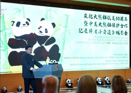 8月24日晚,中国驻美使馆同美史密森学会国家动物园共同举办“大熊猫之夜”招待会,庆祝大熊猫抵美五十周年暨展映《小奇迹》纪录片,并介绍50年来,中美大熊猫保护合作的成果。使馆外交官及美各界嘉宾300余人参加。