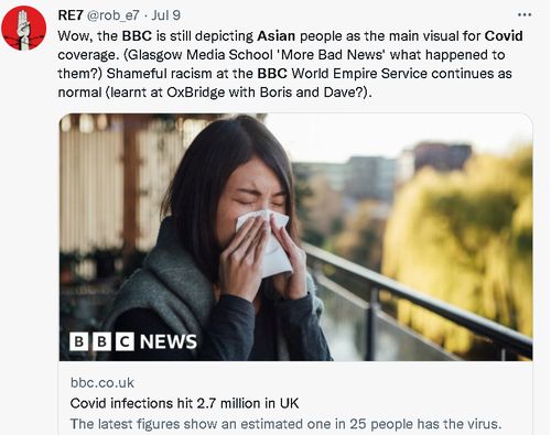 比如今年7月8日,BBC就在一篇题为“英国新冠感染病例已达到270万人”的报道中,使用了一个打喷嚏的亚裔女子的照片作为报道配图。这个配图的选择当时也引起了一些网民的质疑和抨击。